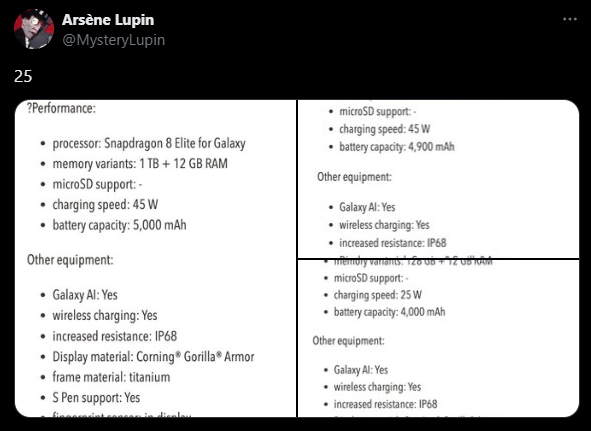 최근 유출자 MysteryLupin은 곧 출시될 갤럭시 S25 트리오의 비공식 스펙 시트를 공개했습니다.